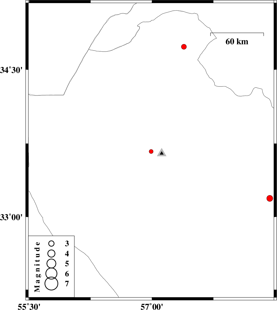 2013/10/02 | 07:15:20.6 | 10:45:20.6 | 33.19 | 58.44 | 16 | ML:3.4 | Khorasan(center) Province, 94 km South-East of Ferdows | ||