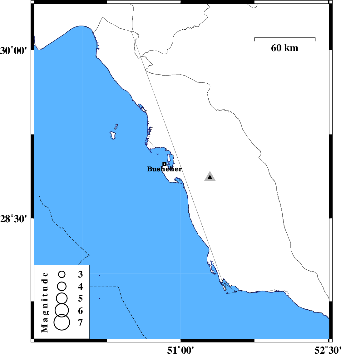 2013/10/21 | 21:10:11.4 | 00:40:11.4 | 28.91 | 51.01 | 15 | ML:3.4 | Bushehr Province, 19 km East of Busheher |