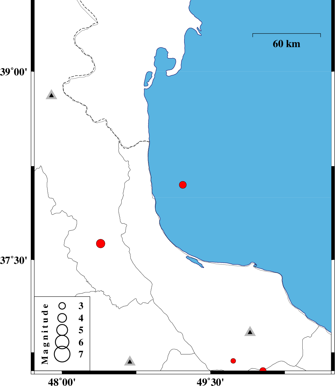 2013/10/21 | 23:28:38.2 | 02:58:38.2 | 38.1 | 49.22 | 15 | ML:3.3 | Caspian Sea, 44 km North-East of Hashtpar | ||