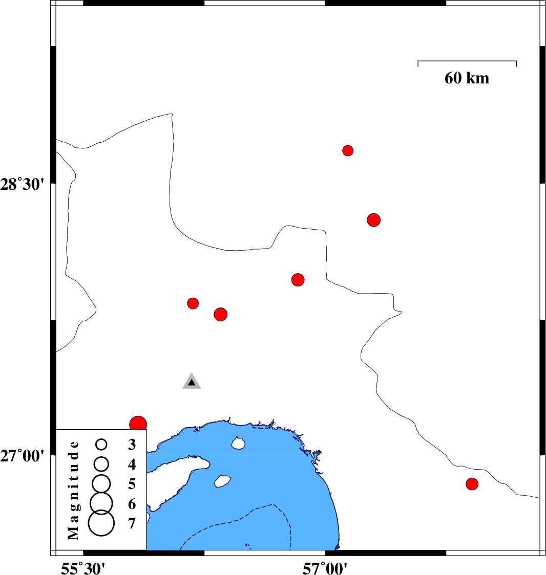 | 2013/10/15 | 12:52:18.8 | 16:22:18.8 | 28.3 | 57.3 | 14 | ML:3.6 | Kerman Province, 55 km North-West of Kahnuj | ||