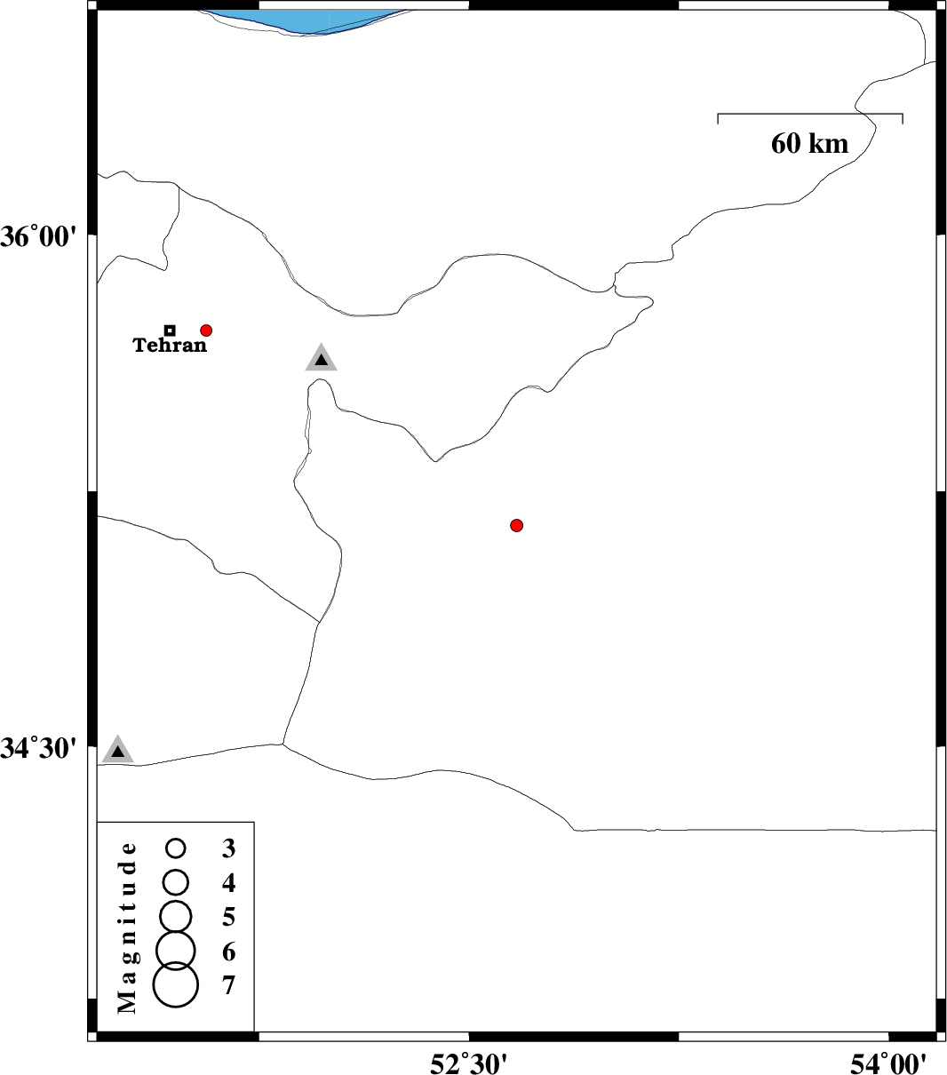 | 2013/10/26 | 09:15:08.9 | 12:45:08.9 | 35.72 | 51.56 | 25 | ML:1.8 | Tehran Province, 15 km East of Tehran | ||