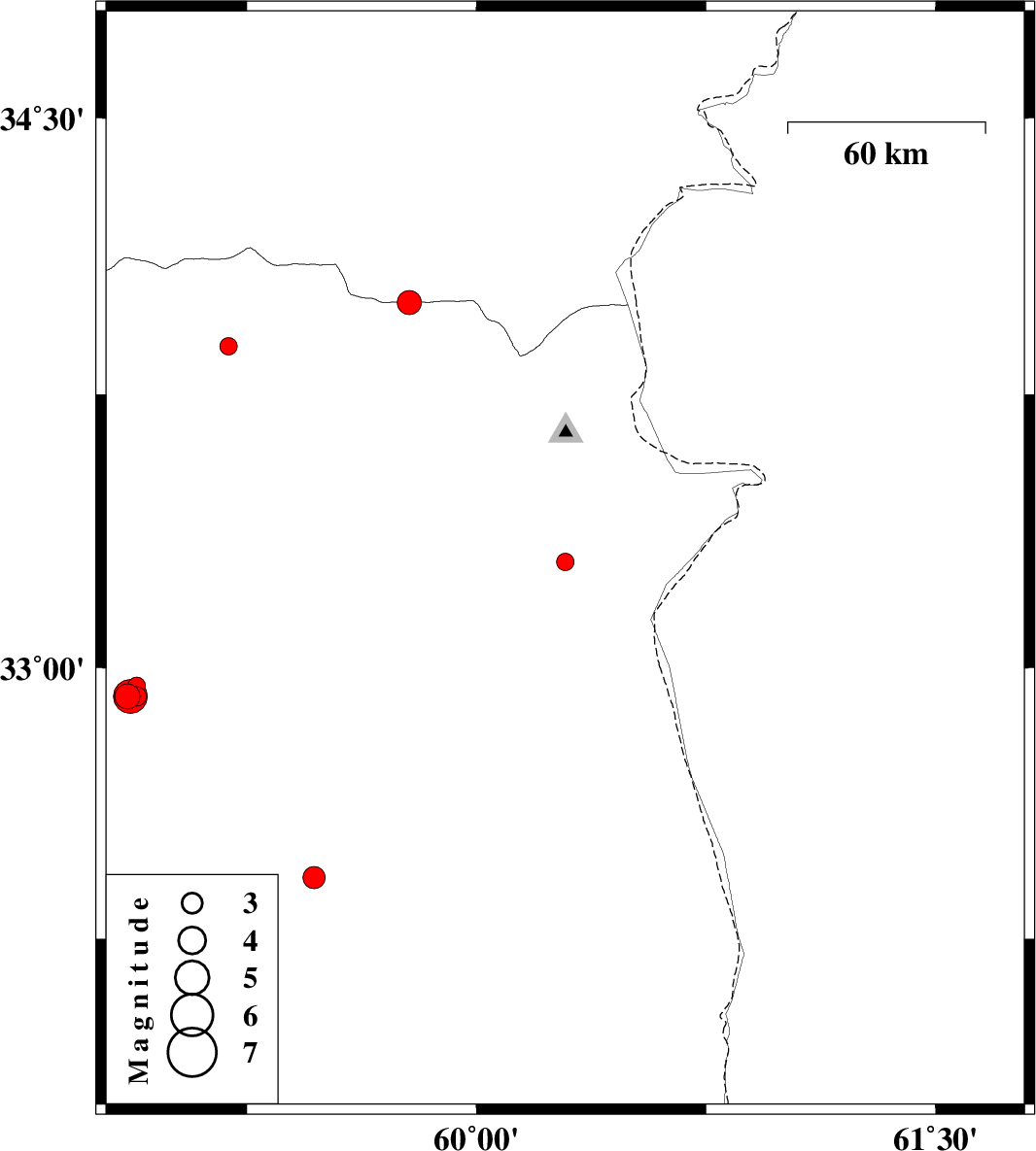 2013/10/05 | 15:56:27.1 | 19:26:27.1 | 32.92 | 58.85 | 14 | ML:2.9 | Khorasan(south) Province, 35 km West of Birjand | ||