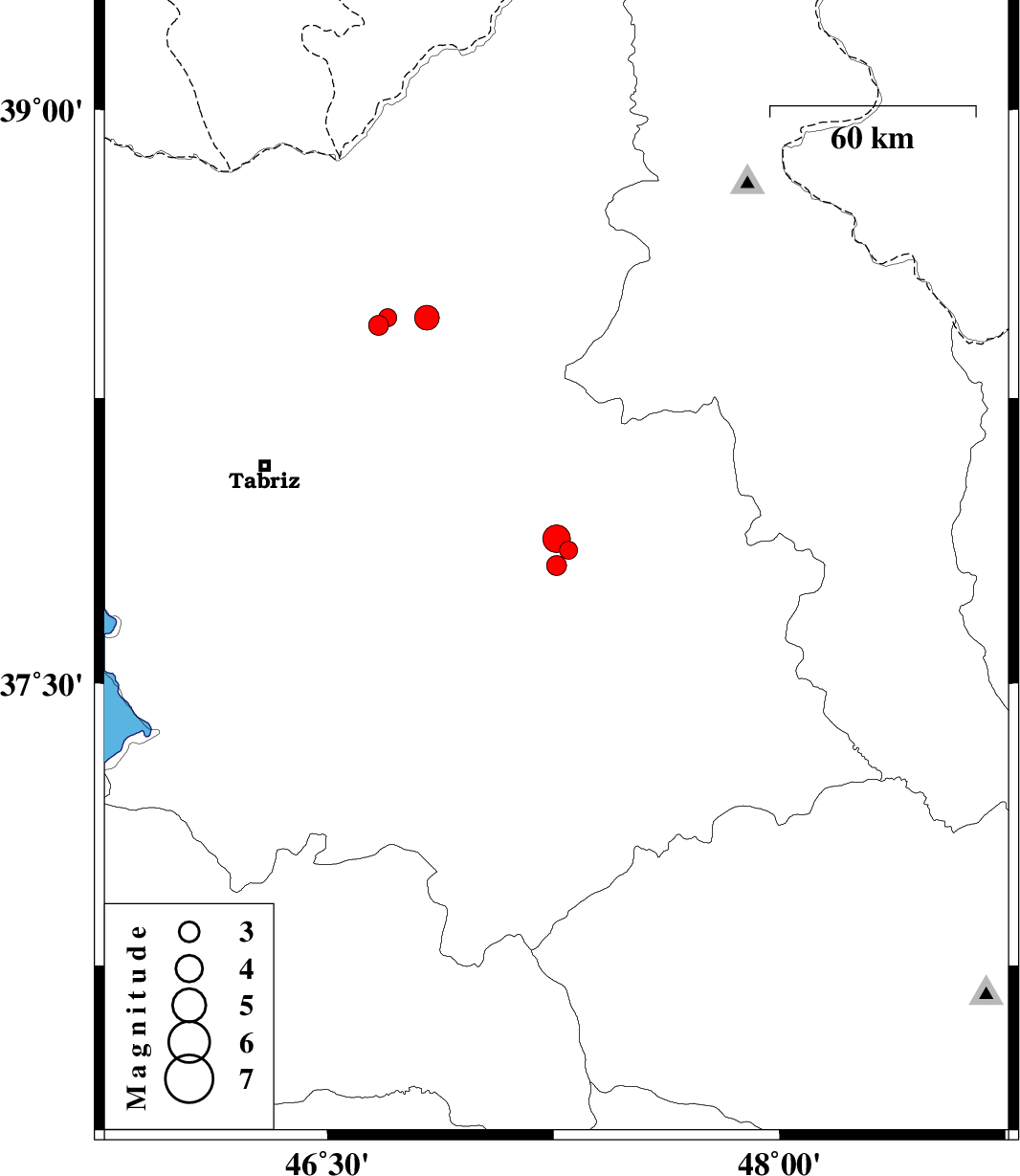 2013/11/05 | 03:29:34.6 | 06:59:34.6 | 37.85 | 47.3 | 16 | ML:2.7 | Azarbaijan Sharghi Province, 23 km West of Sarab | ||