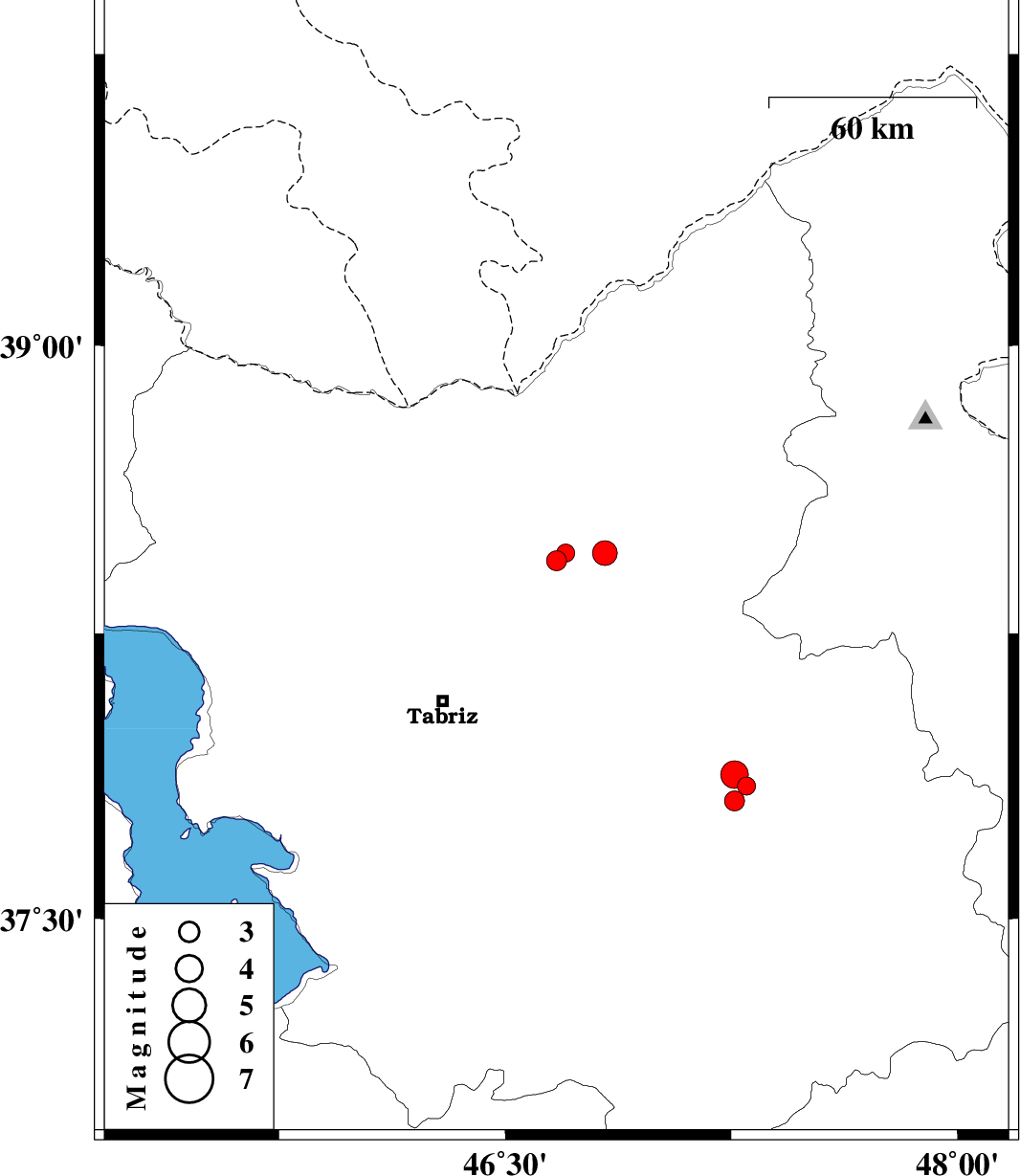 2013/11/04 | 20:11:27.9 | 23:41:27.9 | 38.46 | 46.7 | 15 | ML:2.7 | Azarbaijan Sharghi Province, 33 km West of Ahar | ||