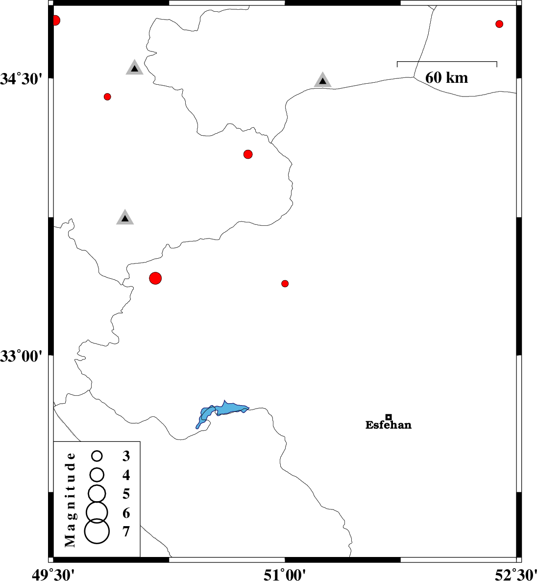 2013/11/02 | 11:20:01.0 | 14:50:01.0 | 33.42 | 50.16 | 14 | ML:3.5 | Esfahan Province, 13 km West of Golpayegan | ||