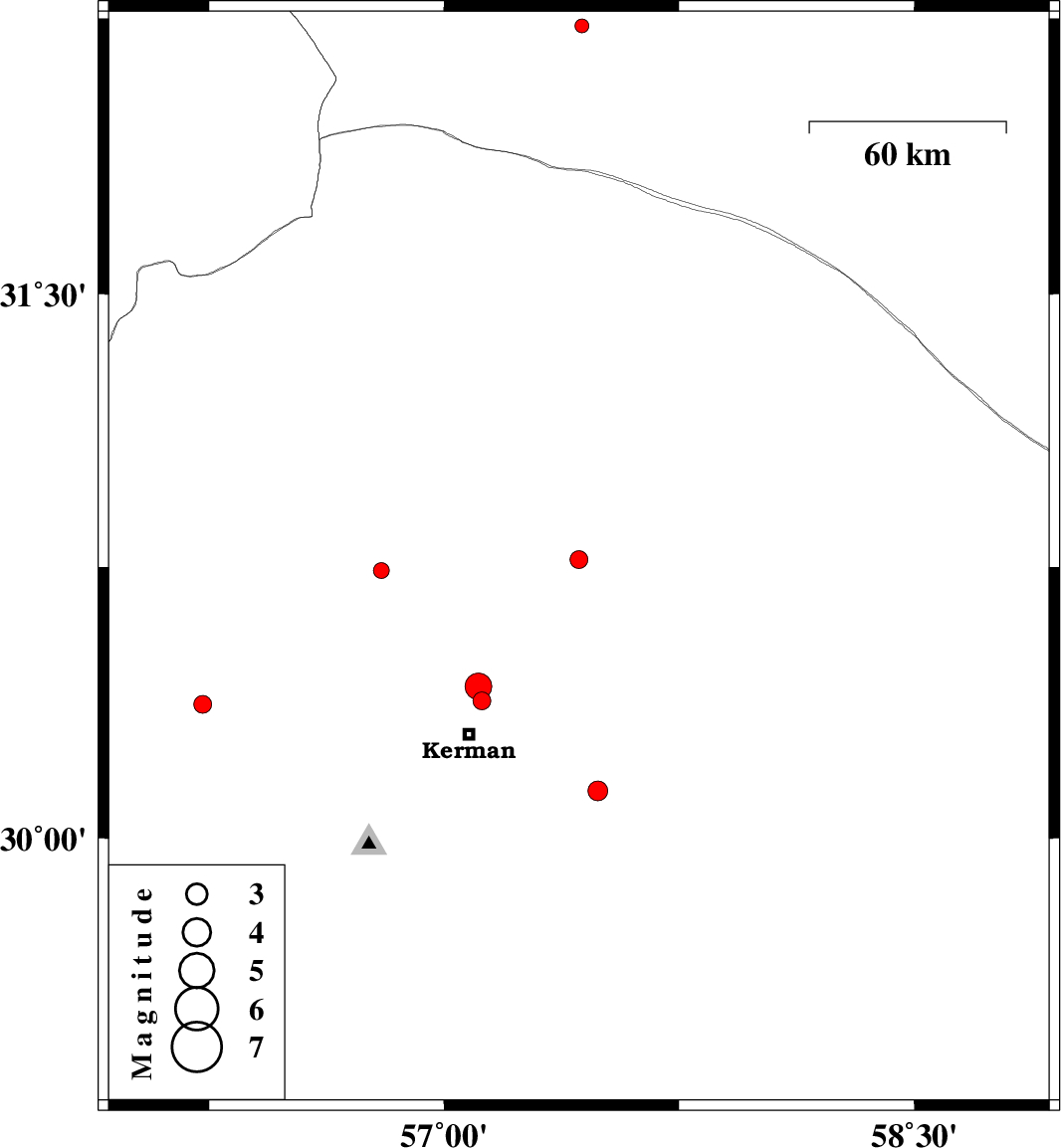 | 2013/11/12 | 02:27:23.4 | 05:57:23.4 | 30.42 | 57.11 | 14 | ML:3.8 | Kerman Province, 15 km North of Kerman | ||