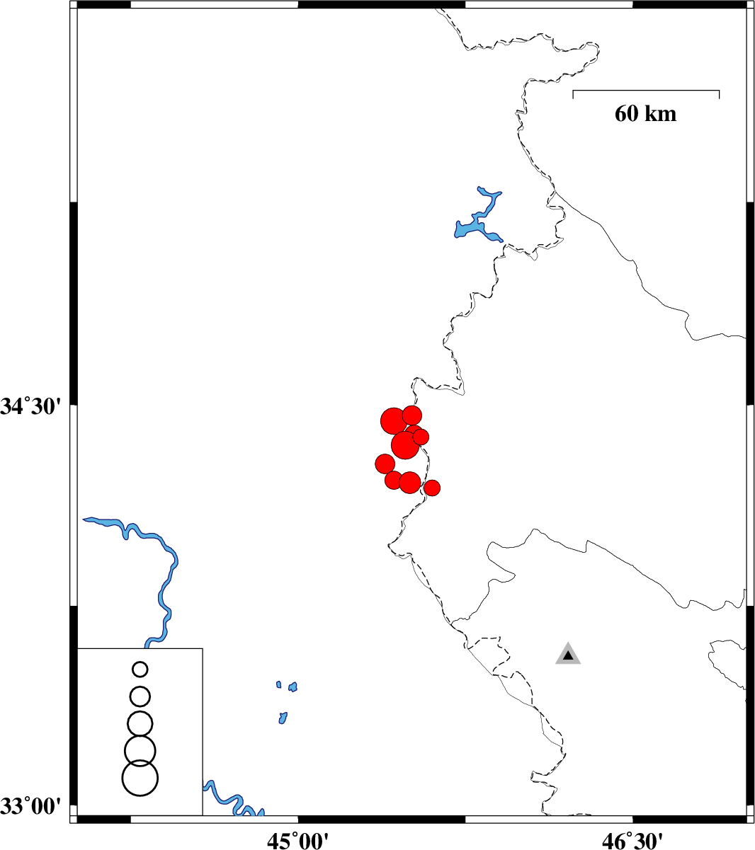 2013/11/22 21:08:02.8 00:38:02.8 34.3845.5515 ML:3.3 Kermanshah Province, 15 km South of Qasr-E-Shirin