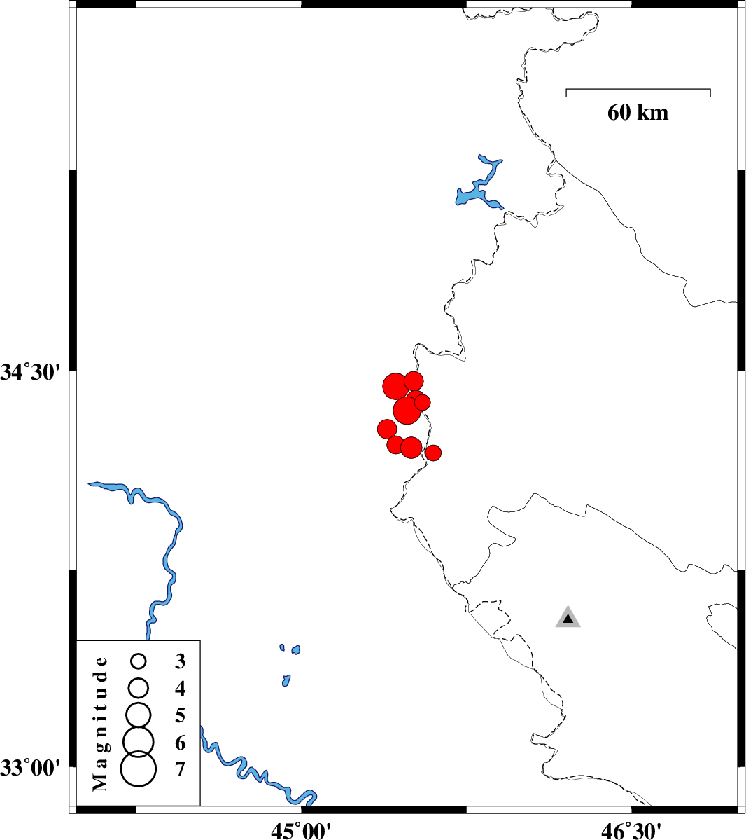2013/11/22 | 06:51:25.7 | 10:21:25.7 | 34.44 | 45.43 | 14 | ML:5.4 | Iraq, 16 km West of Qasr-E-Shirin |