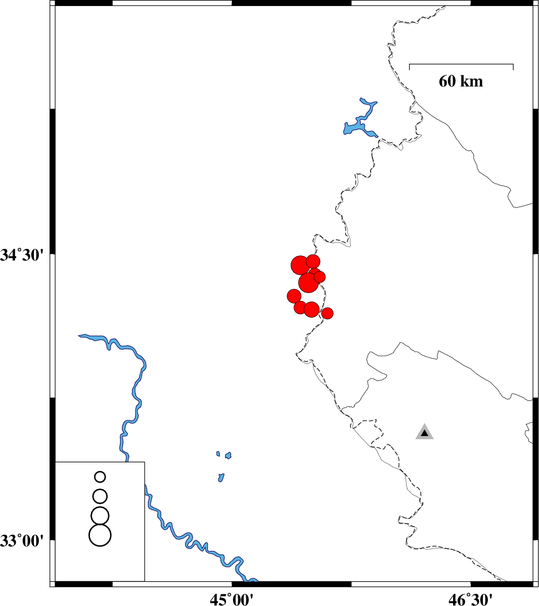 2013/11/22 | 06:51:25.7 | 10:21:25.7 | 34.44 | 45.43 | 14 | ML:5.4 | Iraq, 16 km West of Qasr-E-Shirin |