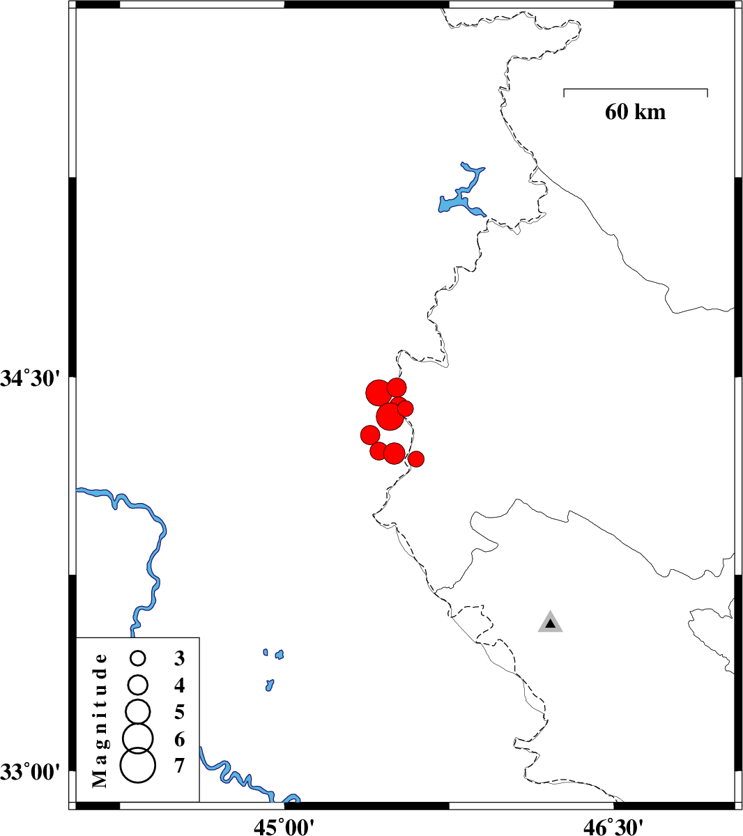 2013/11/22 | 06:51:25.7 | 10:21:25.7 | 34.44 | 45.43 | 14 | ML:5.4 | Iraq, 16 km West of Qasr-E-Shirin |
