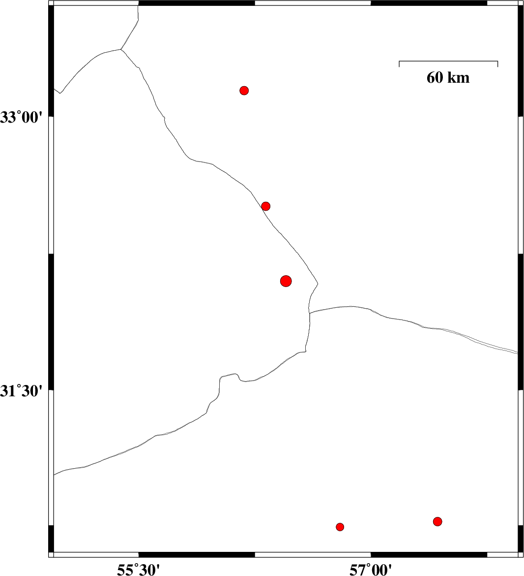 | 2013/11/18 | 11:42:15.2 | 15:12:15.2 | 33.14 | 56.18 | 18 | ML:2.5 | Yazd Province, 86 km South-West of Tabas | ||