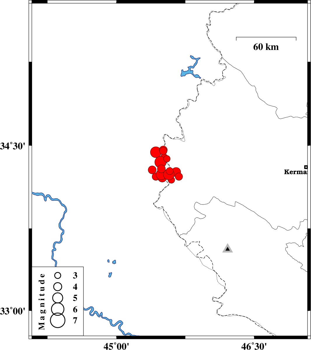 2013/11/22 | 06:51:25.7 | 10:21:25.7 | 34.44 | 45.43 | 14 | ML:5.4 | Iraq, 16 km West of Qasr-E-Shirin |