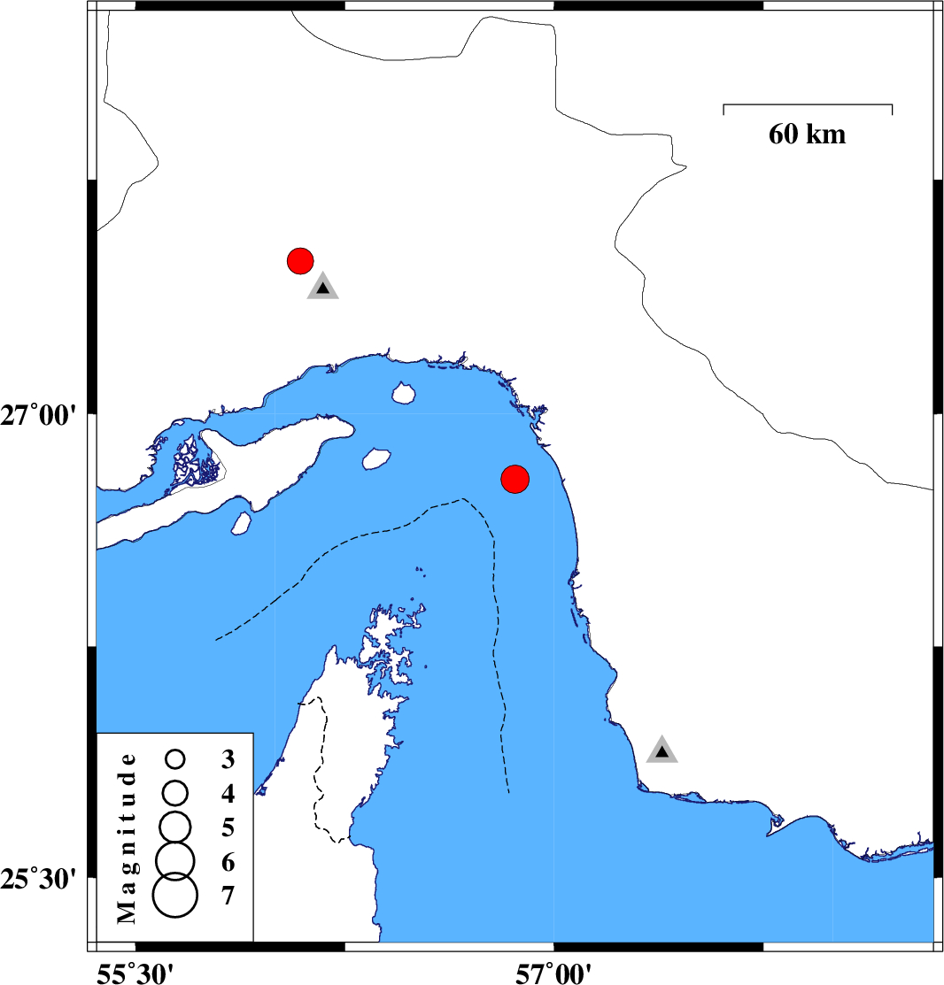 | 2013/11/27 | 07:25:40.5 | 10:55:40.5 | 26.79 | 56.86 | 8 | ML:4.5 | Oman Sea, 46 km South-West of Minab | ||