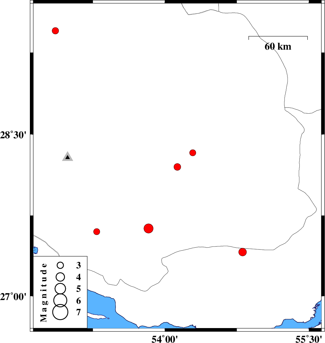 2013/11/27 | 14:43:54.6 | 18:13:54.6 | 28.2 | 54.13 | 15 | ML:3.2 | Fars Province, 62 km North-West of Lar | ||