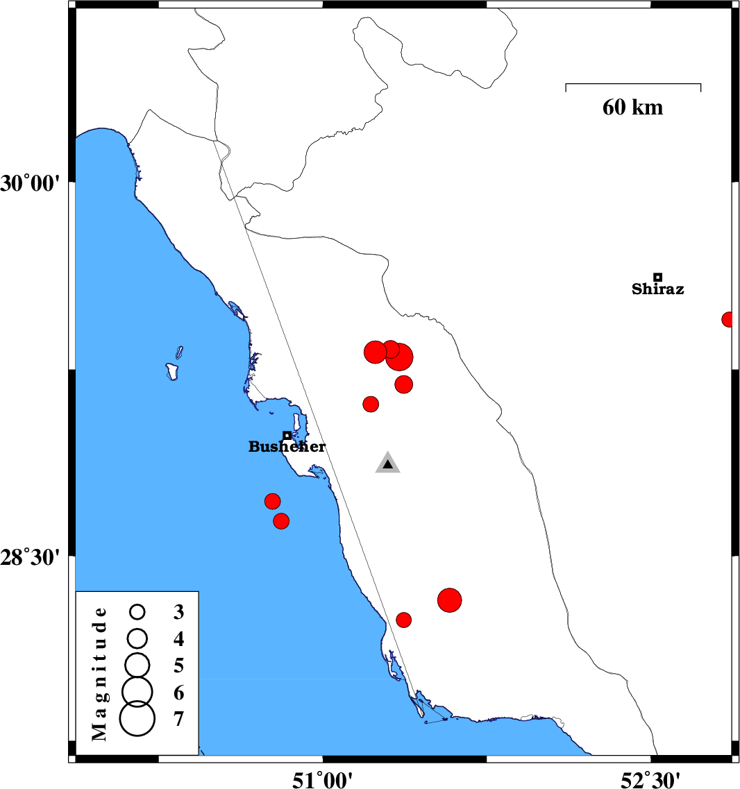 2013/11/08 | 21:14:14.0 | 00:44:14.0 | 28.64 | 50.81 | 15 | ML:3.2 | Persian Gulf, 39 km South of Busheher | ||