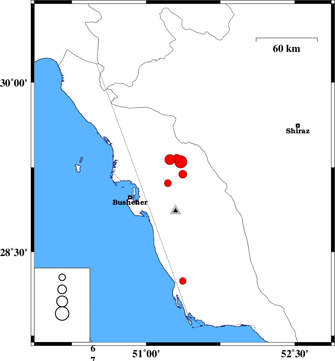 2013/11/28 | 13:51:35.5 | 17:21:35.5 | 29.3 | 51.35 | 15 | ML:5.6 | Bushehr Province, 15 km East of Borazjan | ||