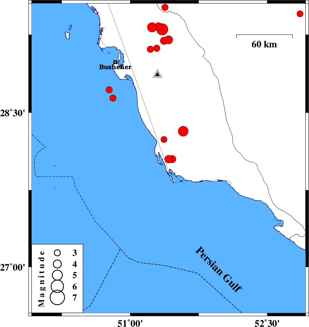 2013/11/29 | 18:46:04.3 | 22:16:04.3 | 29.12 | 51.29 | 15 | ML:3.2 | Bushehr Province, 18 km South of Borazjan | ||