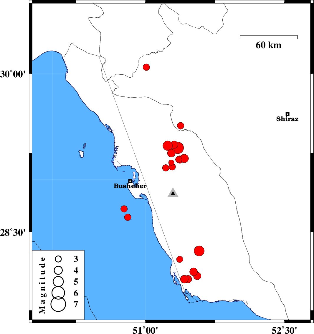 2013/11/08 | 21:14:14.0 | 00:44:14.0 | 28.64 | 50.81 | 15 | ML:3.2 | Persian Gulf, 39 km South of Busheher |