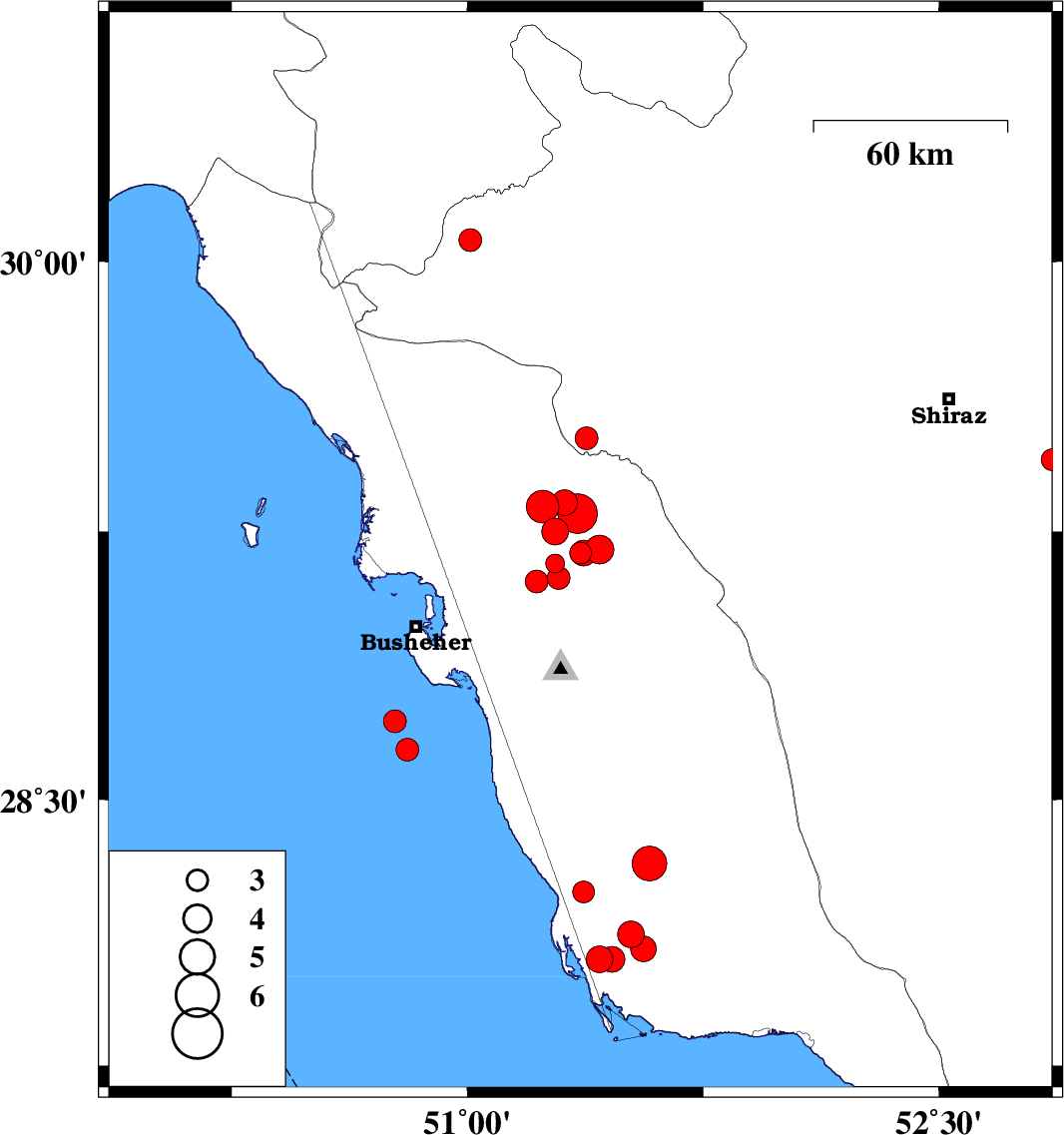 2013/11/08 | 21:14:14.0 | 00:44:14.0 | 28.64 | 50.81 | 15 | ML:3.2 | Persian Gulf, 39 km South of Busheher | ||