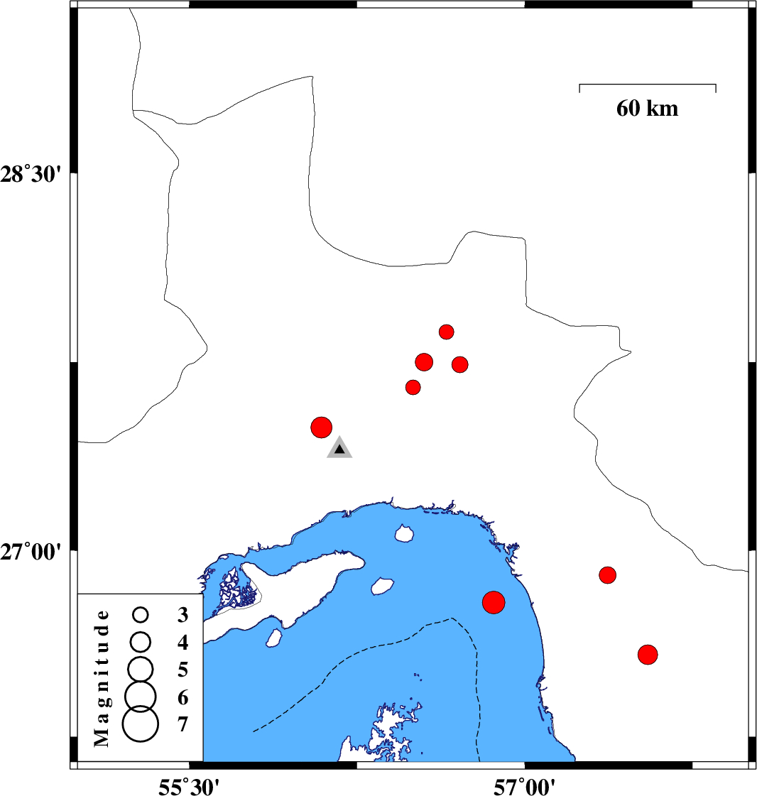 2013/12/06 | 09:06:36.4 | 12:36:36.4 | 27.65 | 56.5 | 14 | ML:3 | Hormozgan Province, 56 km North-East of Bandar-e abbas | ||