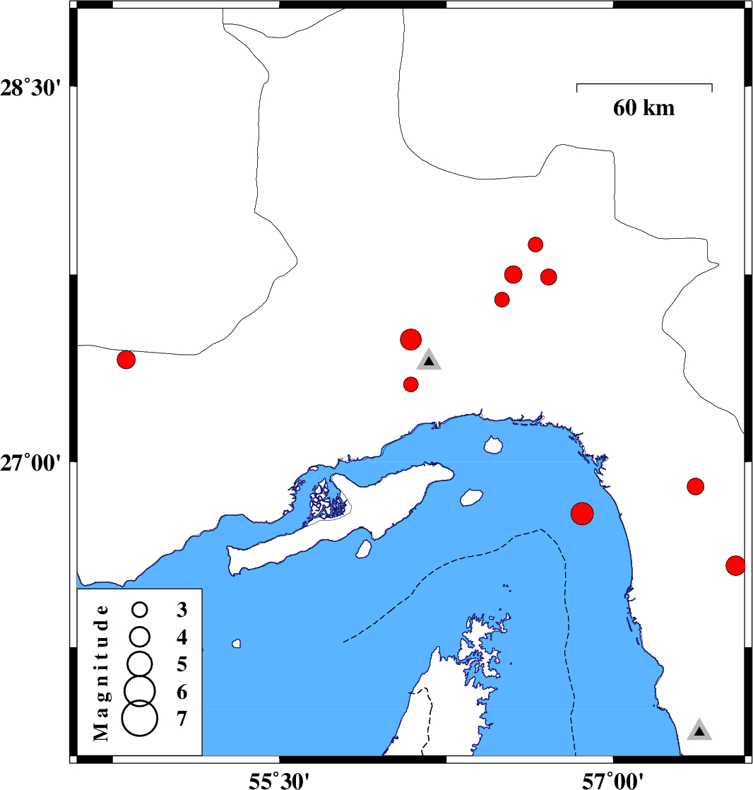 2013/12/06 | 09:06:36.4 | 12:36:36.4 | 27.65 | 56.5 | 14 | ML:3 | Hormozgan Province, 56 km North-East of Bandar-e abbas | ||