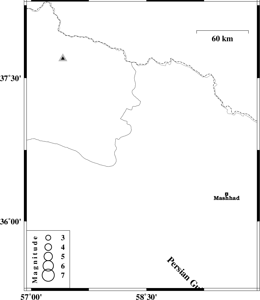 2013/12/07 | 23:12:42.5 | 02:42:42.5 | 36.79 | 58.44 | 14 | ML:4.2 | Khorasan(center) Province, 36 km South of Quchan |