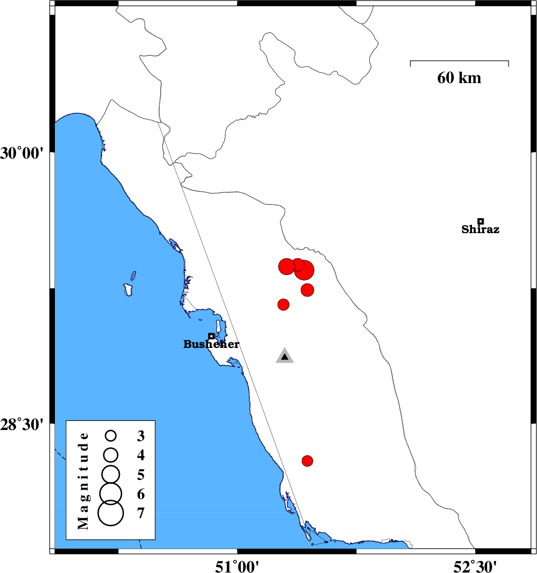 2013/11/28 | 13:51:35.5 | 17:21:35.5 | 29.3 | 51.35 | 15 | ML:5.6 | Bushehr Province, 15 km East of Borazjan | ||