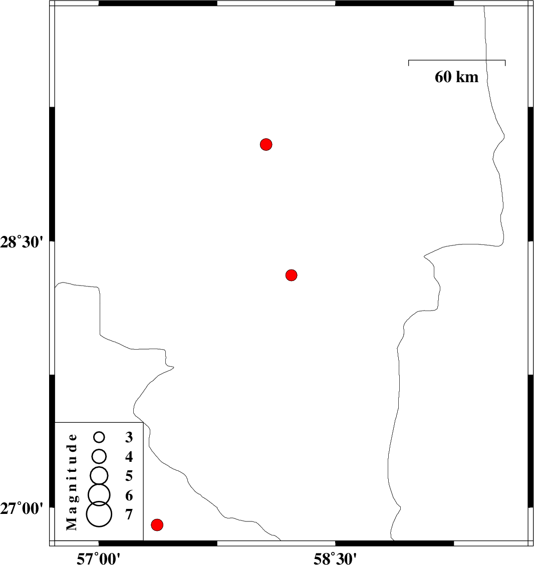 2013/12/05 | 11:28:50.1 | 14:58:50.1 | 29.04 | 58.06 | 15 | ML:3.4 | Kerman Province, 30 km West of Bam | ||