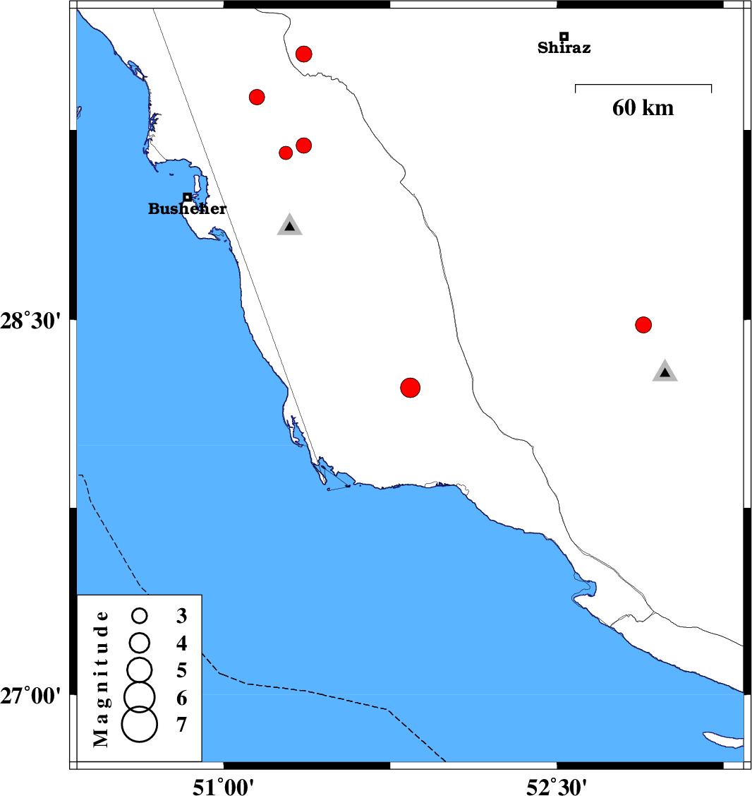 2013/12/10 | 06:59:27.6 | 10:29:27.6 | 28.23 | 51.84 | 8 | ML:3.9 | Bushehr Province, 50 km North-West of Bandar-e kangan | ||