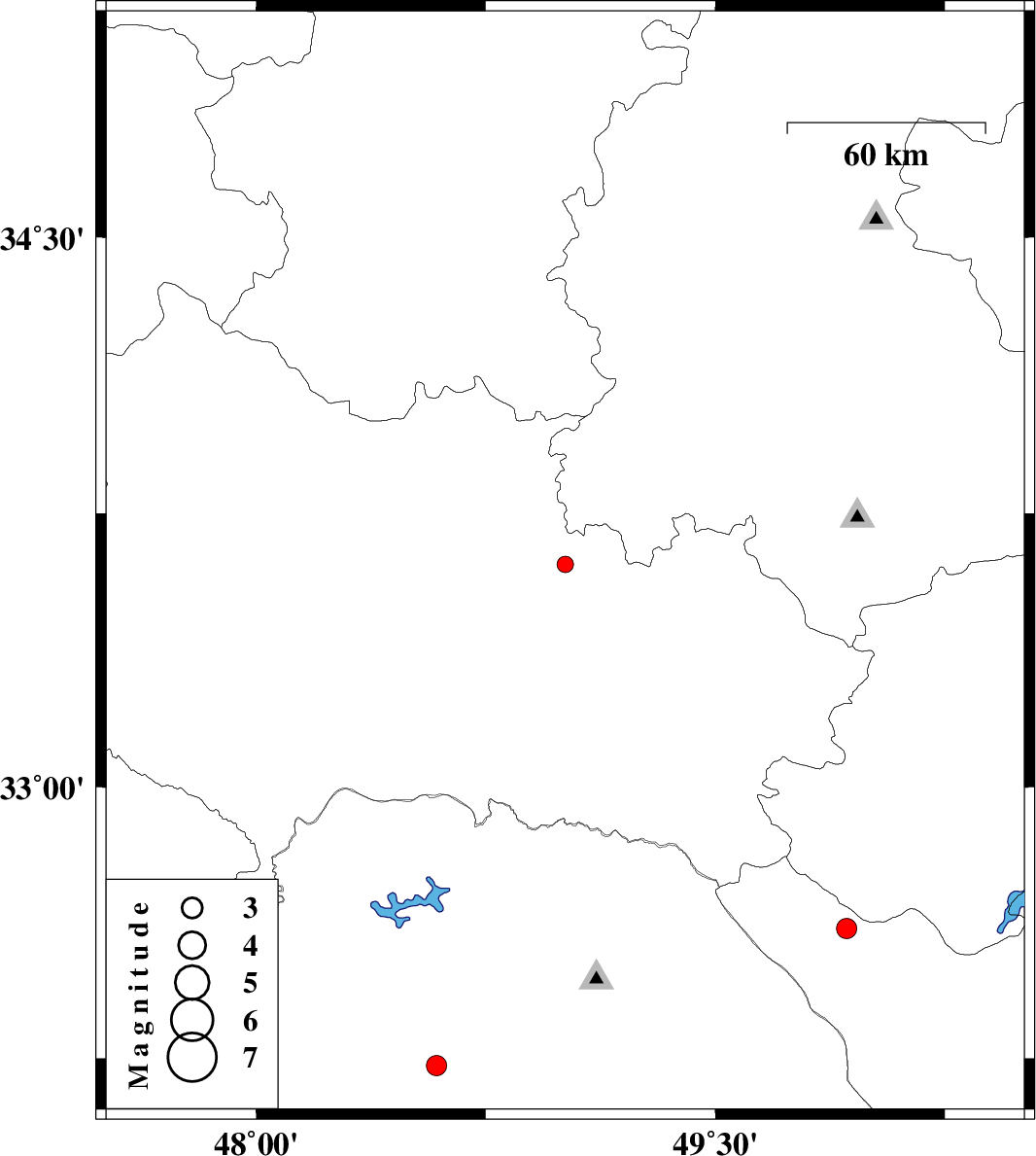 2013/12/12 | 03:15:45.1 | 06:45:45.1 | 33.61 | 49.01 | 14 | ML:2.4 | Lorestan Province, 16 km North of Dorud | ||