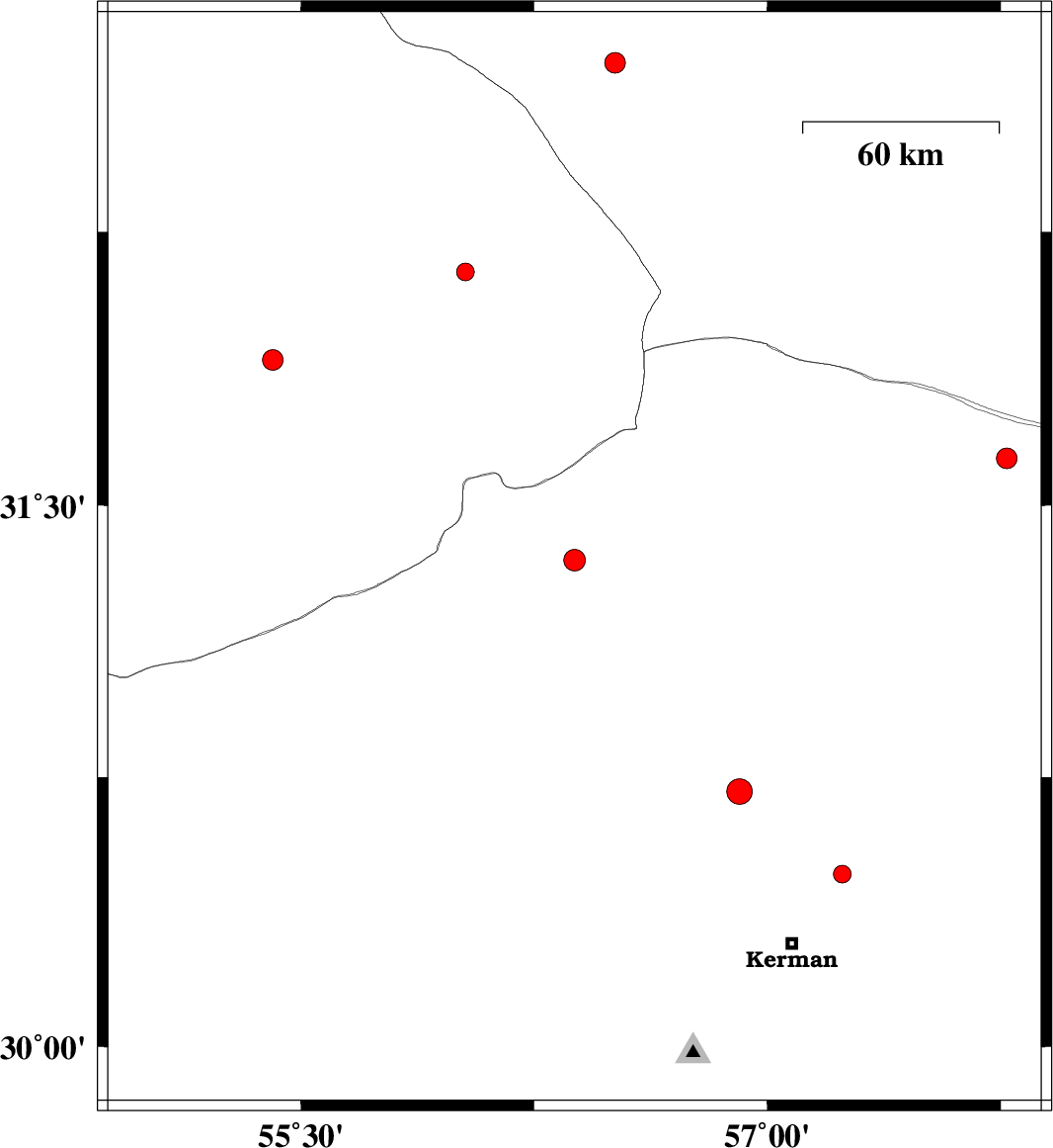 | 2013/12/12 | 11:41:05.3 | 15:11:05.3 | 30.71 | 56.91 | 17 | ML:3.7 | Kerman Province, 35 km South-East of Zarand | ||
