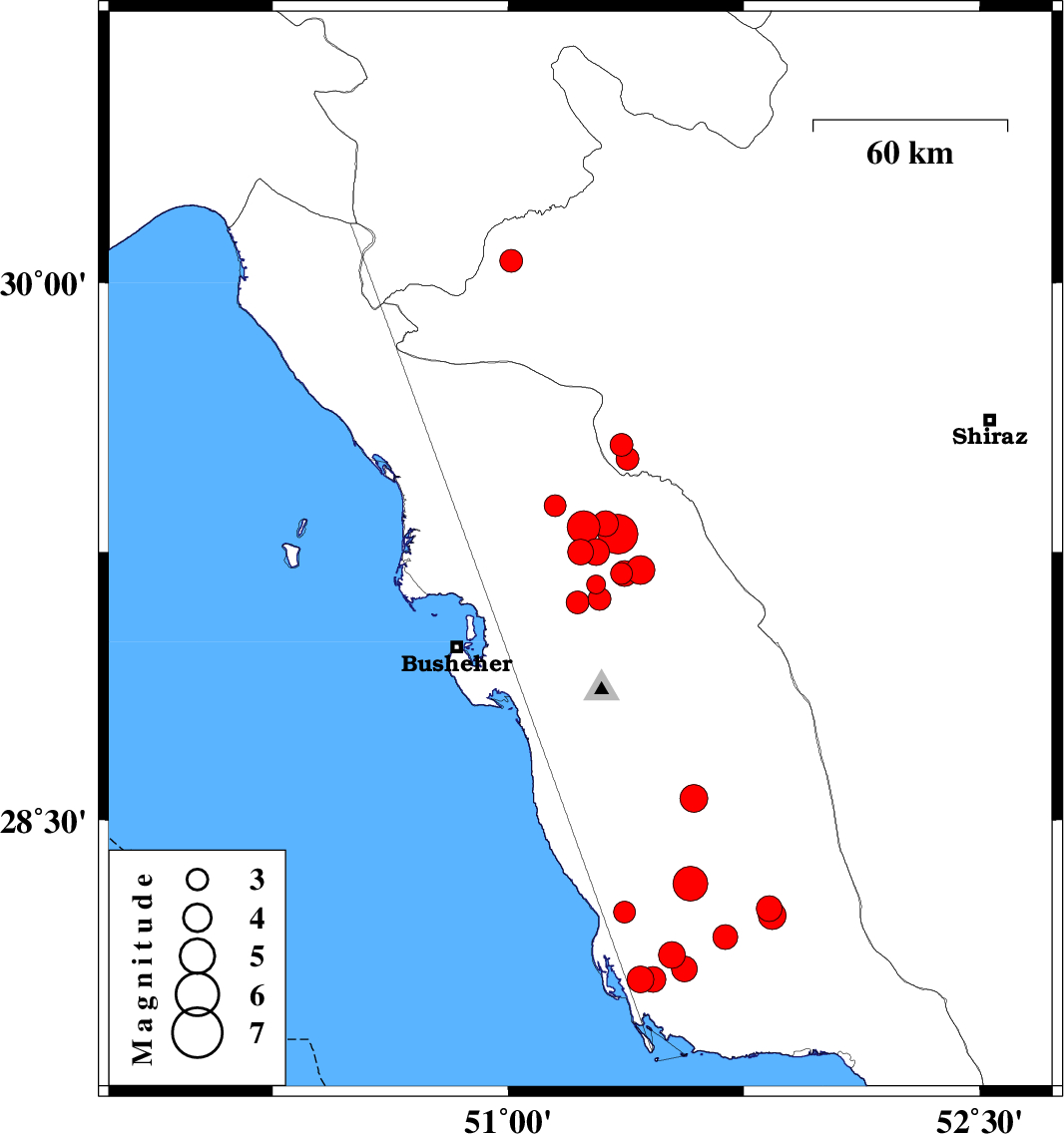 2013/11/19 | 09:06:21.4 | 12:36:21.4 | 28.32 | 51.58 | 7 | ML:4.9 | Bushehr Province, 43 km South-East of Khormog |