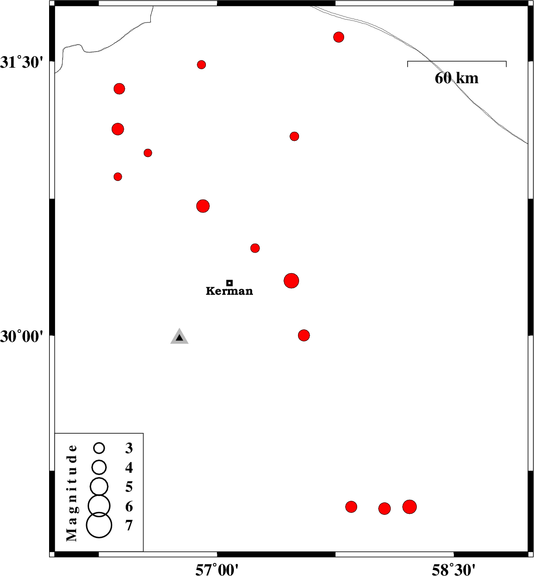 2013/12/26 | 00:44:26.6 | 04:14:26.6 | 30.3 | 57.47 | 18 | ML:4.3 | Kerman Province, 38 km East of Kerman | ||