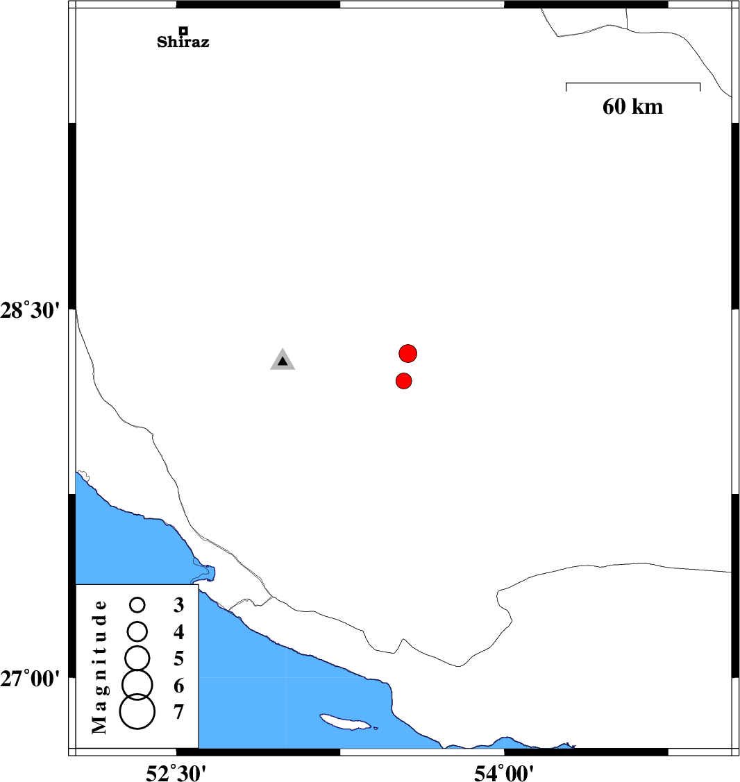 2013/12/29 | 13:27:21.3 | 16:57:21.3 | 28.32 | 53.56 | 17 | ML:3.6 | Fars Province, 20 km South of Jahrom | ||