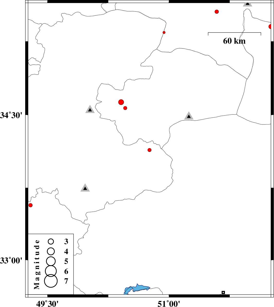 2013/12/03 | 19:56:05.8 | 23:26:05.8 | 34.57 | 50.46 | 14 | ML:2 | Qom Province, 38 km West of Qom | ||