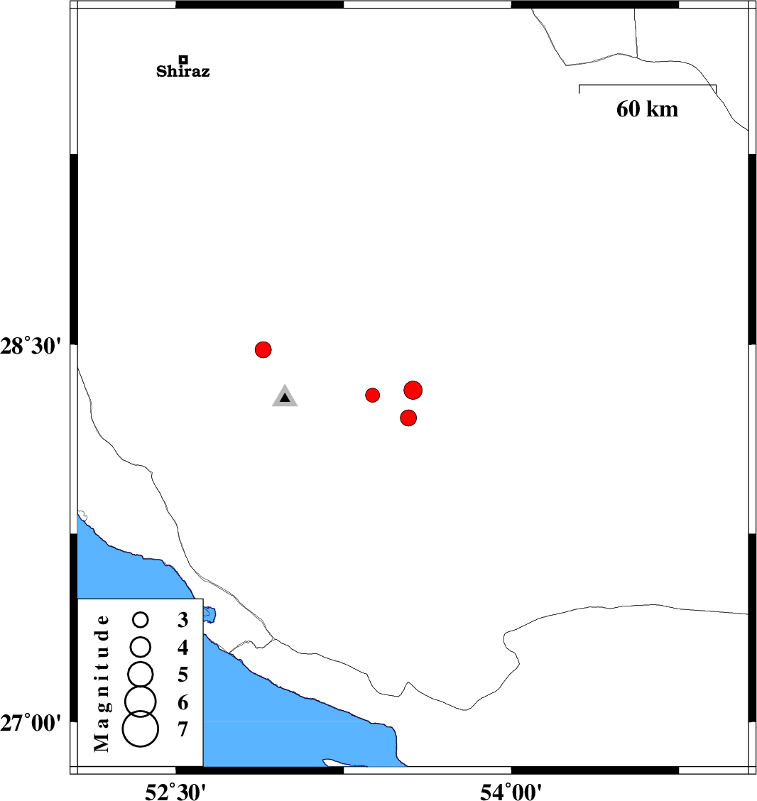 2013/12/29 | 13:27:21.3 | 16:57:21.3 | 28.32 | 53.56 | 17 | ML:3.6 | Fars Province, 20 km South of Jahrom | ||