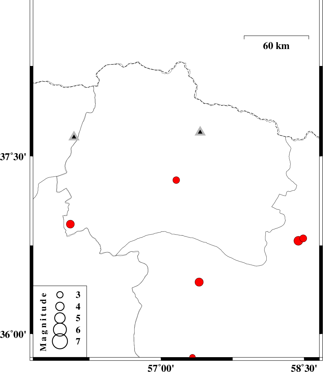 2014/01/01 | 11:01:27.6 | 14:31:27.6 | 37.3 | 57.16 | 14 | ML:3.2 | Khorasan(north) Province, 25 km South-West of Bojnurd | ||