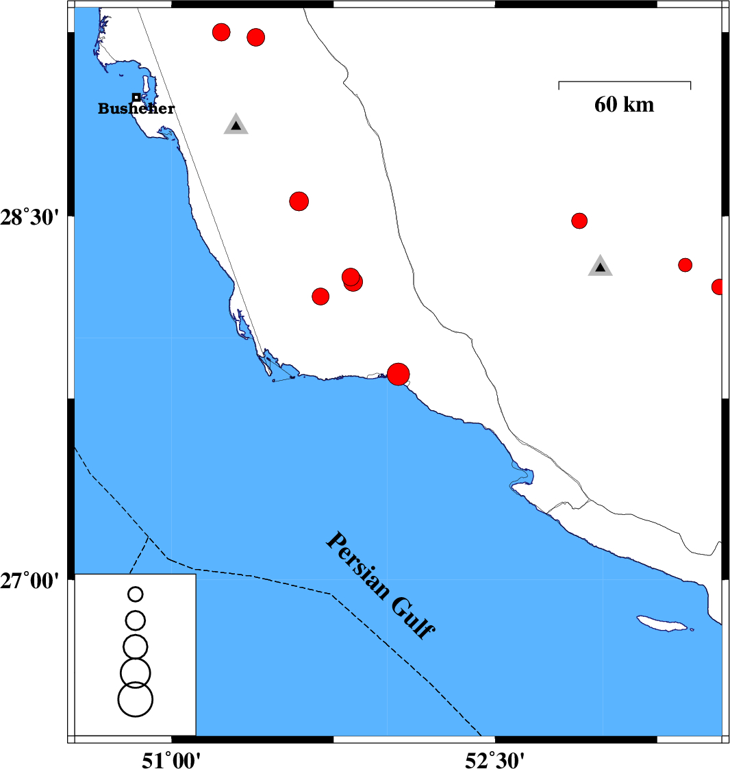 2013/12/18 | 10:59:56.3 | 14:29:56.3 | 29.25 | 51.23 | 6 | ML:3.6 | Bushehr Province, 2 km Borazjan | ||