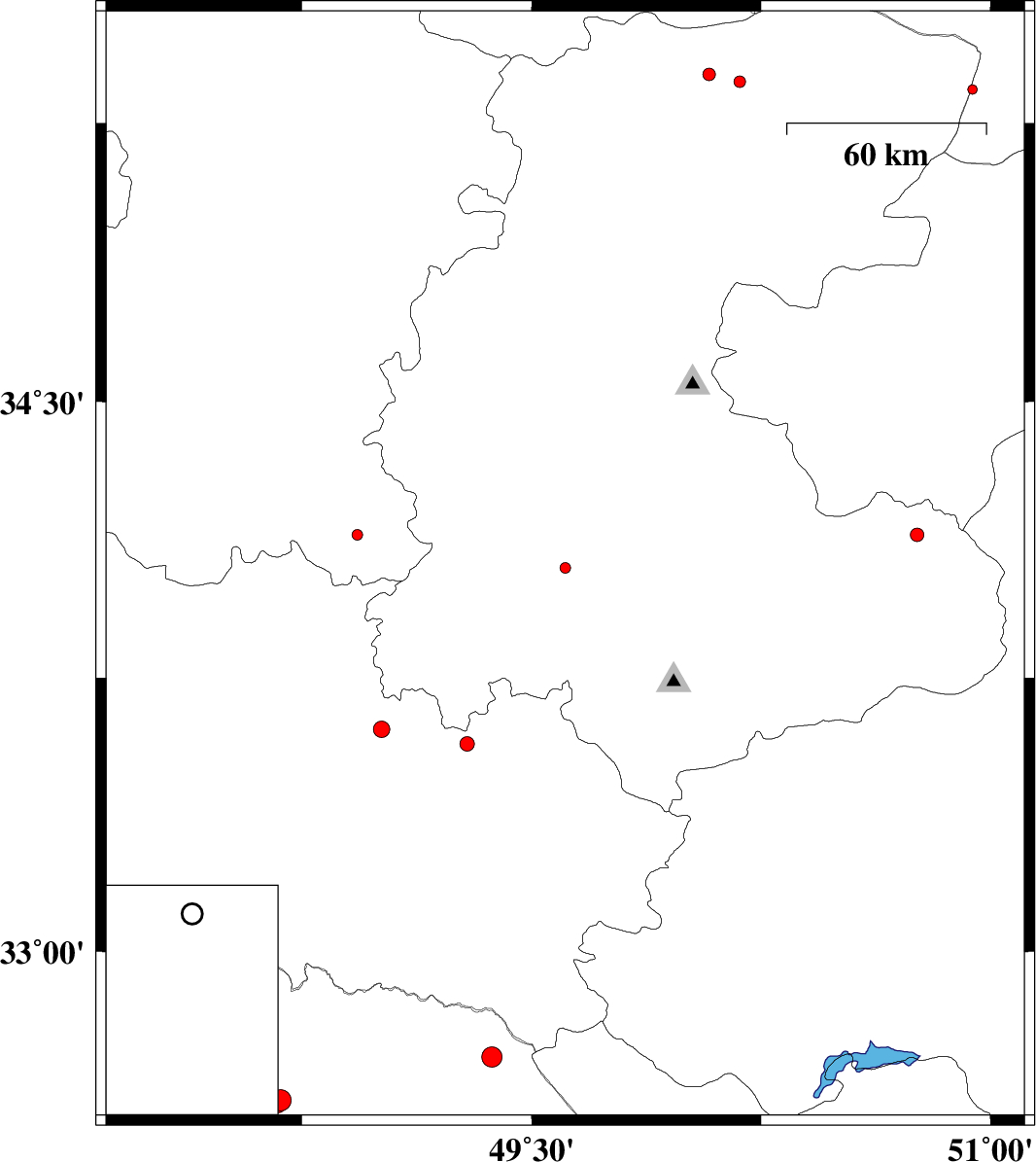 2013/12/27 | 04:01:39.2 | 07:31:39.2 | 33.57 | 49.29 | 15 | ML:2.1 | Lorestan Province, 21 km North-West of Azna | ||