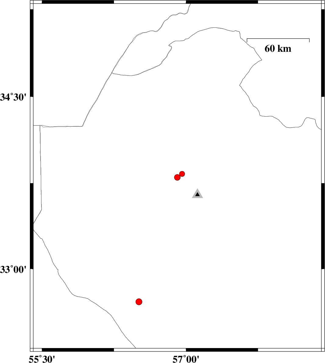 2014/01/08 | 18:40:12.3 | 22:10:12.3 | 33.83 | 56.96 | 12 | ML:2.6 | Yazd Province, 25 km North of Tabas | ||