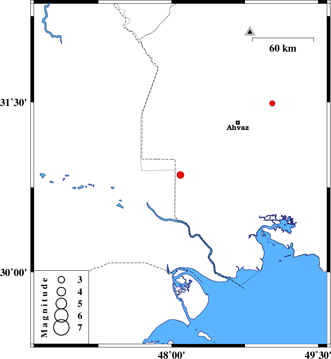 | 2014/01/13 | 17:44:36.3 | 21:14:36.3 | 30.86 | 48.09 | 15 | ML:3.3 | Khoozestan Province, 50 km North-West of Khorramshahr | ||