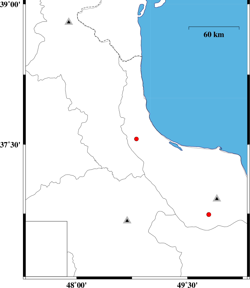 2014/01/15 | 18:00:21.9 | 21:30:21.9 | 37.56 | 48.81 | 14 | ML:2.5 | Gilan Province, 28 km South of Hashtpar | ||