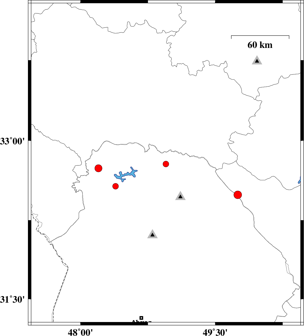 2014/01/17 | 19:59:35.5 | 23:29:35.5 | 32.78 | 48.95 | 43 | ML:2.9 | Khoozestan Province, 46 km North-West of Lali | ||