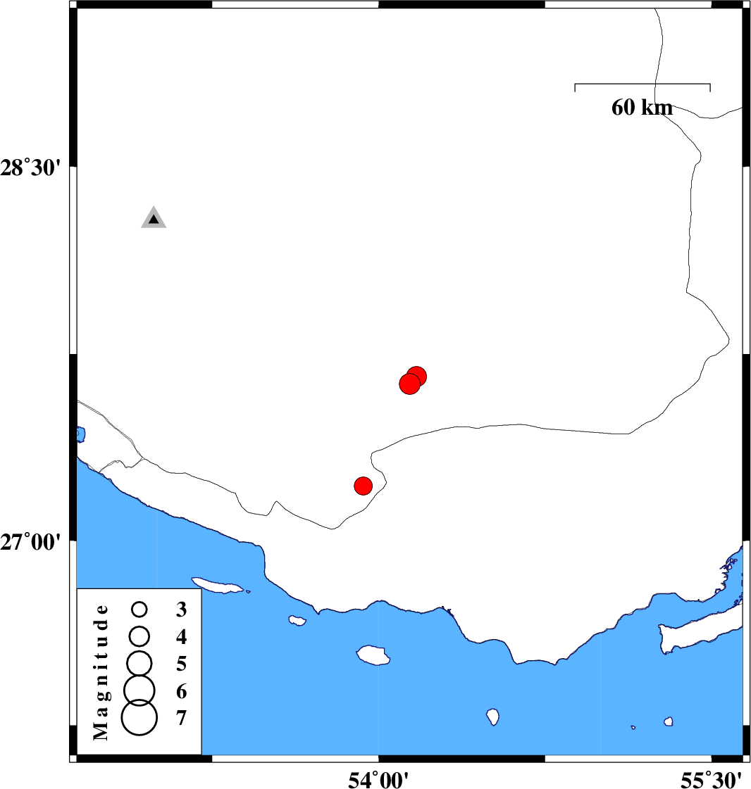2014/01/18 | 12:33:30.6 | 16:03:30.6 | 27.22 | 53.93 | 46 | ML:3.7 | Fars Province, 43 km West of Bastak |