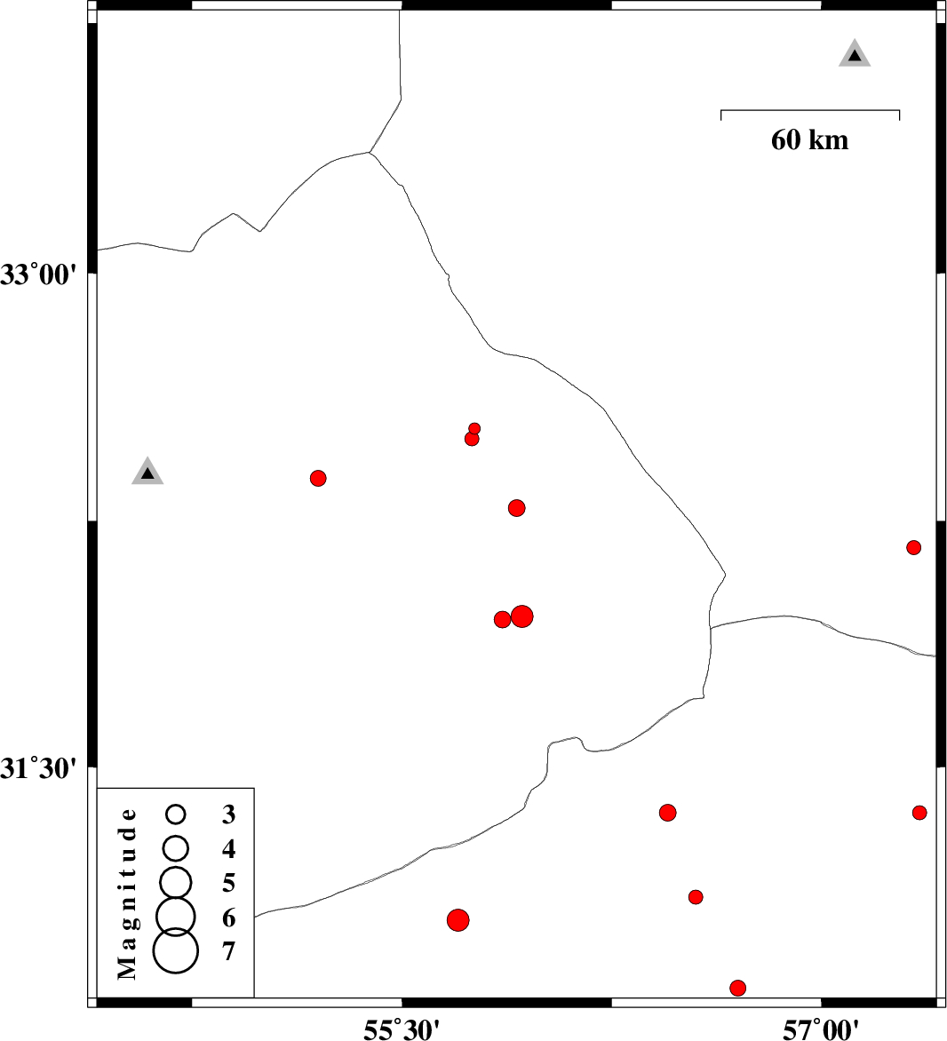 2014/01/22 | 01:54:54.8 | 05:24:54.8 | 32.38 | 55.2 | 16 | ML:2.6 | Yazd Province, 89 km North-West of Bafq | ||