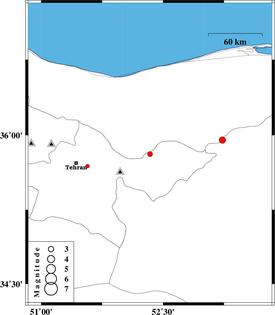 | 2014/01/16 | 07:27:46.8 | 10:57:46.8 | 35.69 | 51.57 | 34 | ML:2.1 | Tehran Province, 15 km East of Tehran |