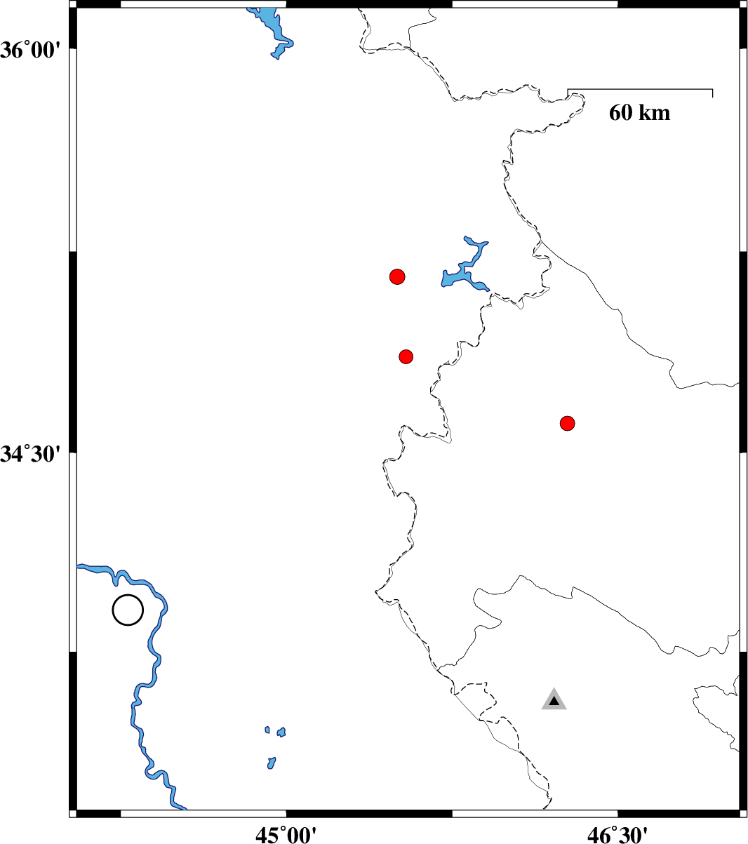 2014/01/23 | 06:41:02.8 | 10:11:02.8 | 34.65 | 45.55 | 39 | ML:3.1 | Iraq, 16 km North of Qasr-E-Shirin | ||