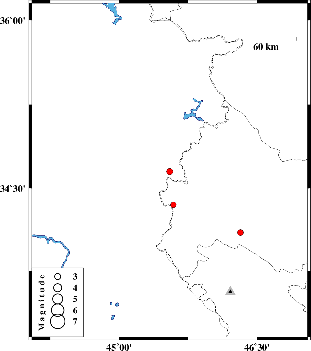 2014/01/23 | 06:41:02.8 | 10:11:02.8 | 34.65 | 45.55 | 39 | ML:3.1 | Iraq, 16 km North of Qasr-E-Shirin | ||