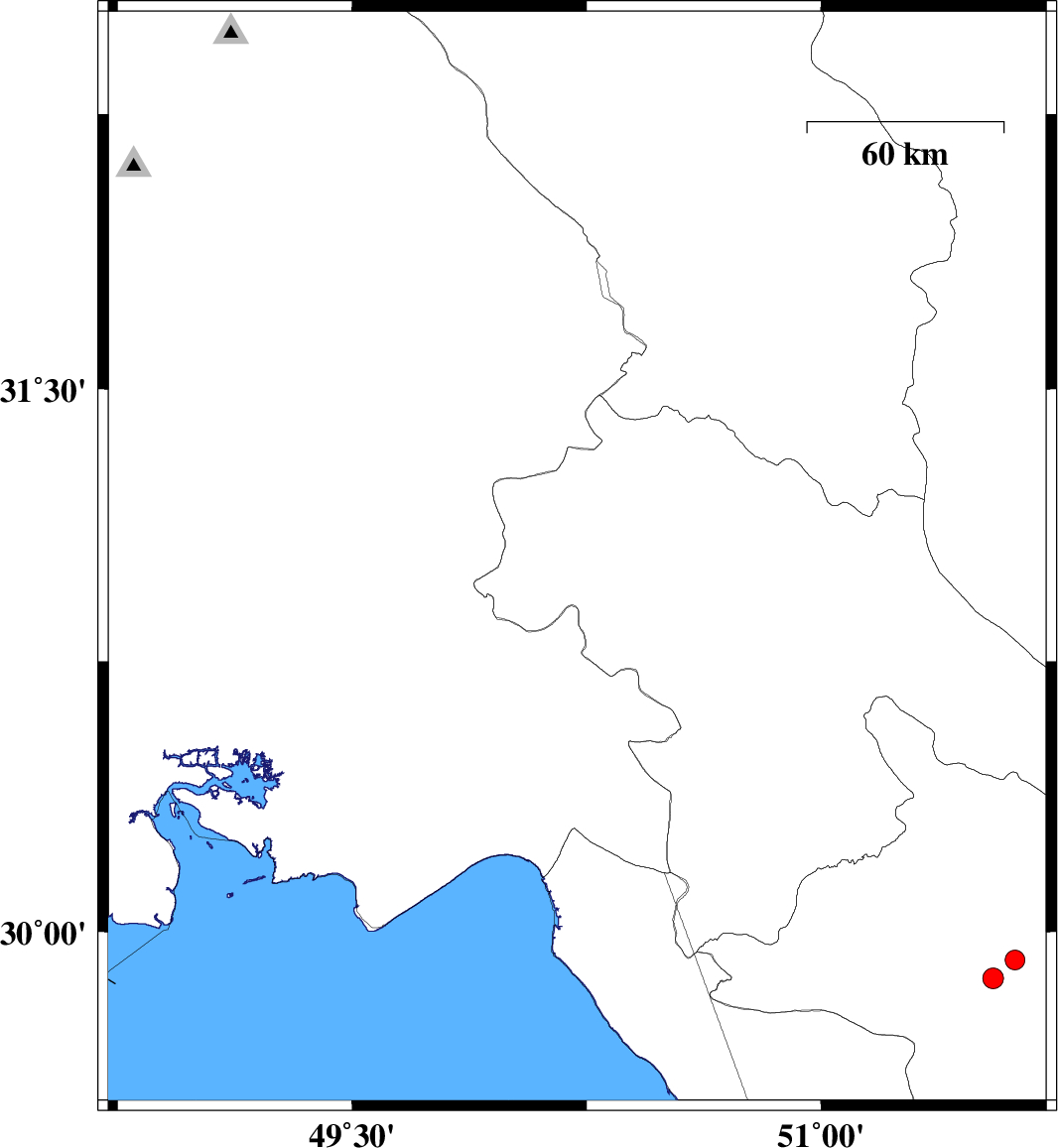 2014/01/16 | 02:13:07.1 | 05:43:07.1 | 30.79 | 49.28 | 14 | ML:2.9 | Khoozestan Province, 28 km North of Bandar-e mahshahr | ||