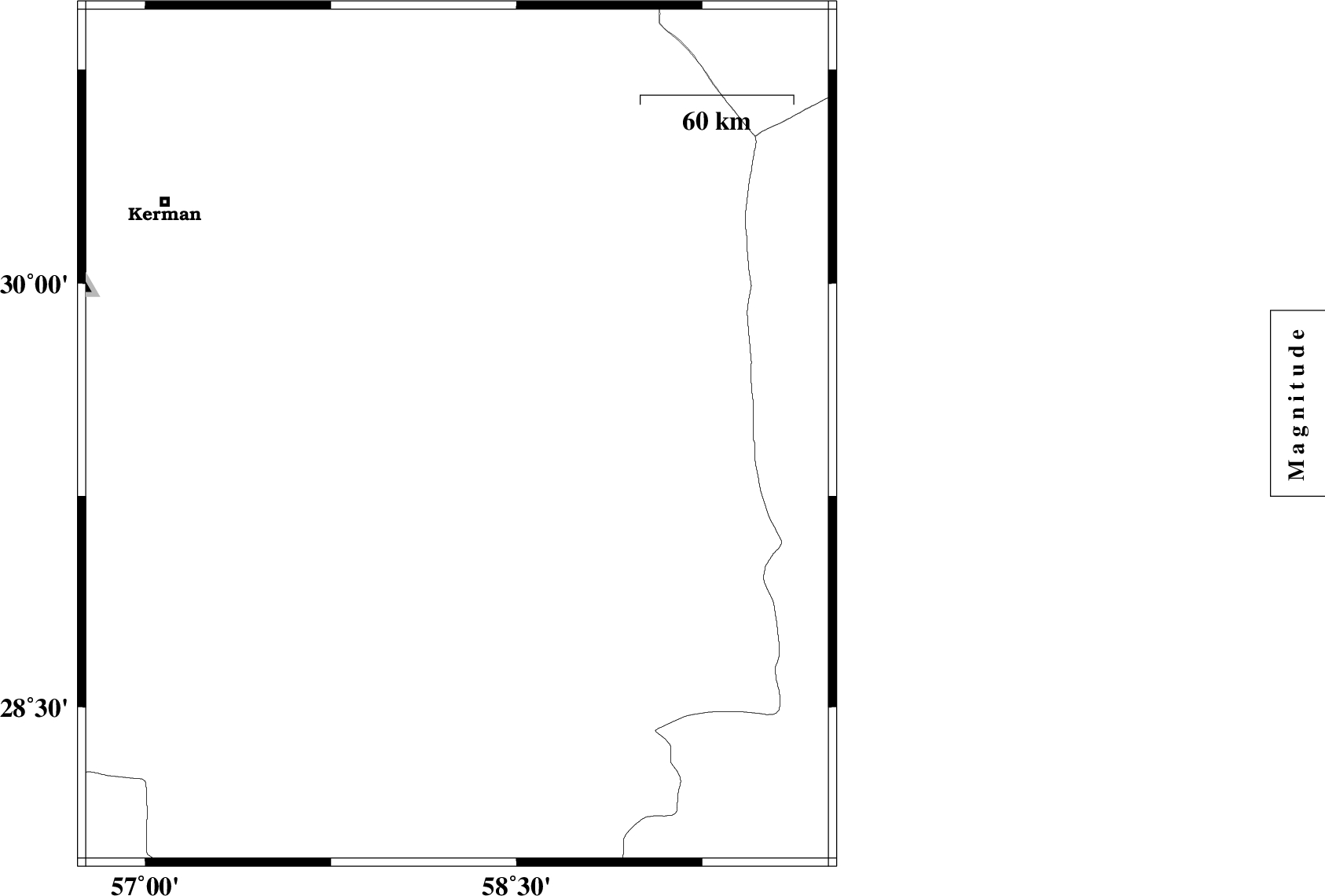 2014/01/24 | 17:11:36.5 | 20:41:36.5 | 29.46 | 58.26 | 37 | ML:2.5 | Kerman Province, 40 km North of Bam |